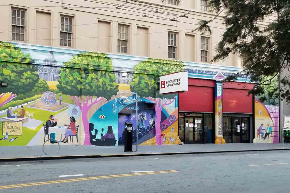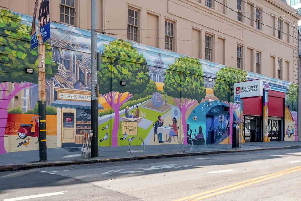Arguably our most gorgeous mural to date, this mural was designed with the SF urban pedestrian traffic and proud Hayes Valley location in mind. It pays homage to the Hayes Valley neighborhood’s hyper-local gems including the SFJAZZ Center, the home of City Arts & Lectures, Patricia’s Green and the historic Painted Ladies Victorians. Design: McHale Creative; installation: Mural Décor.